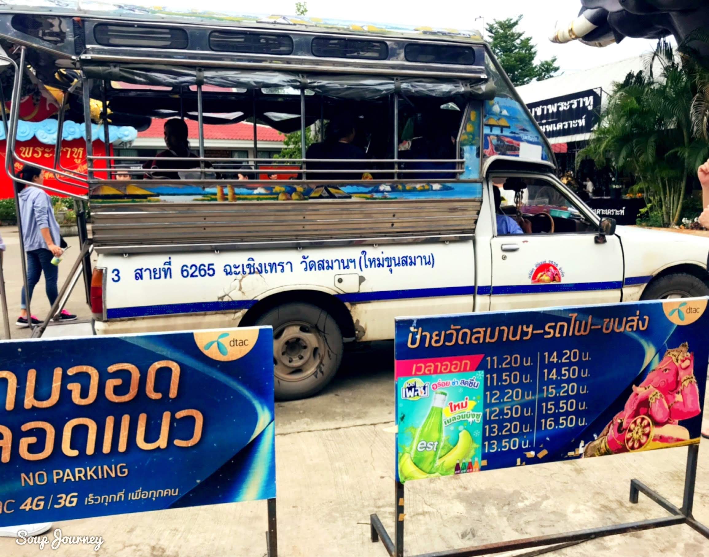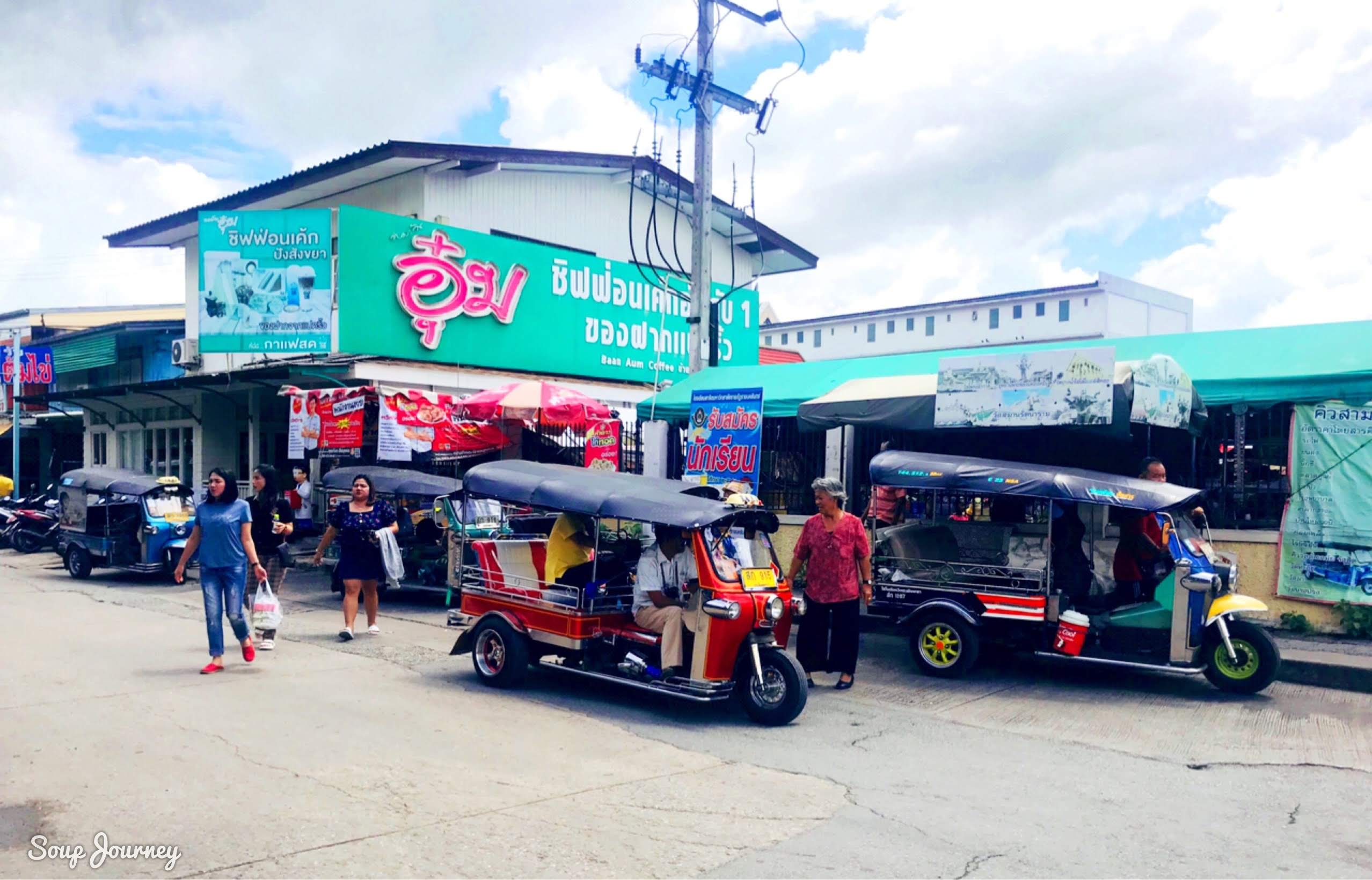 從索通寺並無雙條車前往新屋市場,故可在舊寺對面的嘟嘟車招呼站搭乘前往,單程車資為100泰銖。