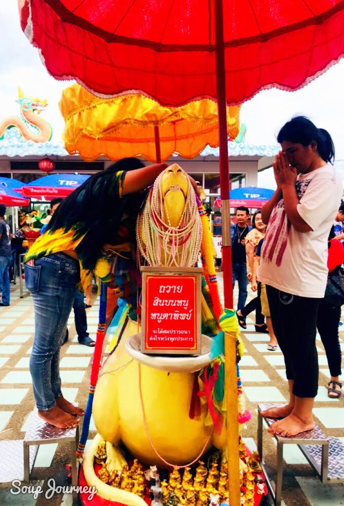 信眾們會將熟食雞蛋撥開幾顆,露出蛋白,並在旁邊放上一瓶水,來感謝神明,據說這種還願方式全泰國就只有這裡才看得到喔!